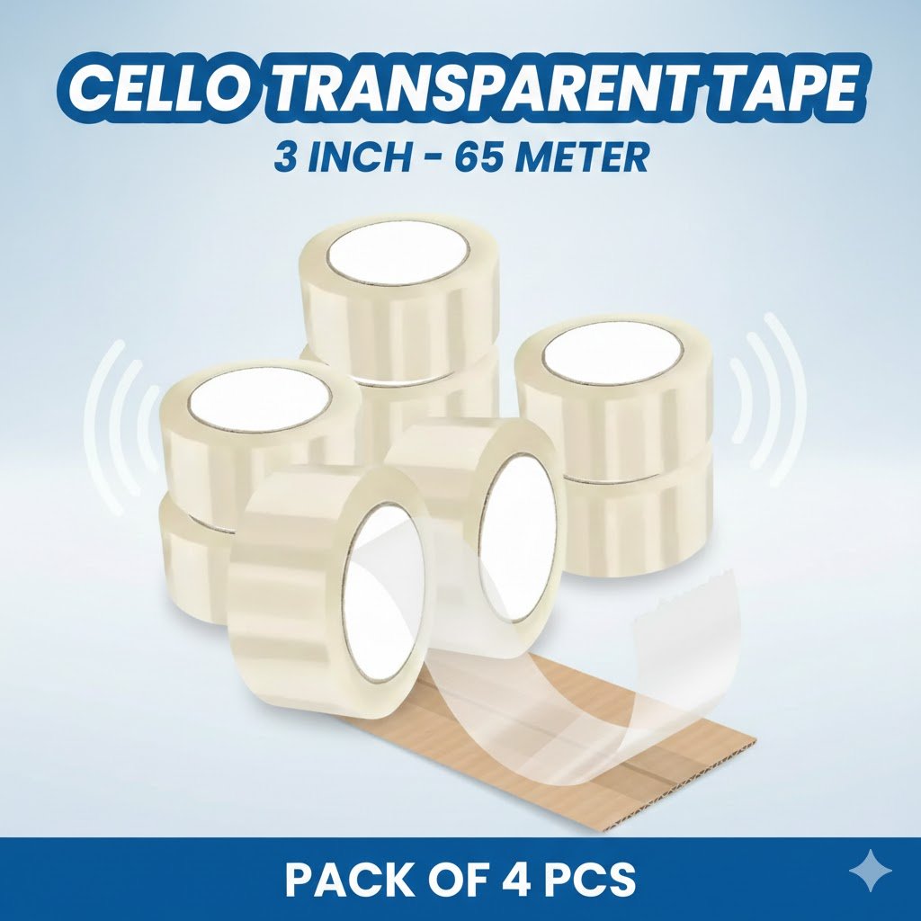 Cello Transparent Tape 3 Inch- 65 Meter,(Pack of 4 pcs)