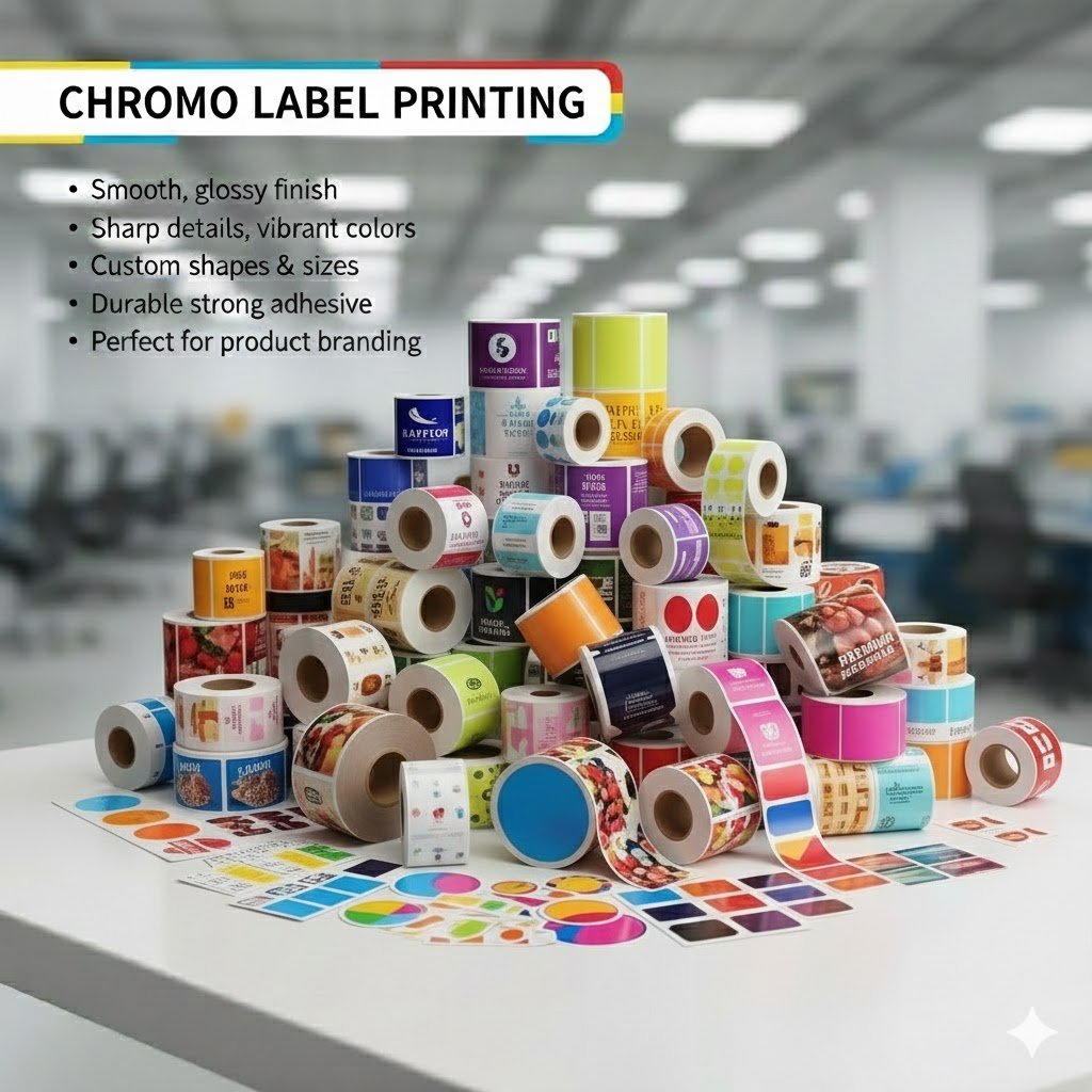 Chromo label printing is a reliable and cost-effective solution for high-quality product labeling. Known for its smooth surface and excellent print clarity, chromo paper delivers sharp text, vibrant colors, and a professional finish, making it ideal for packaging, branding, and retail labeling.