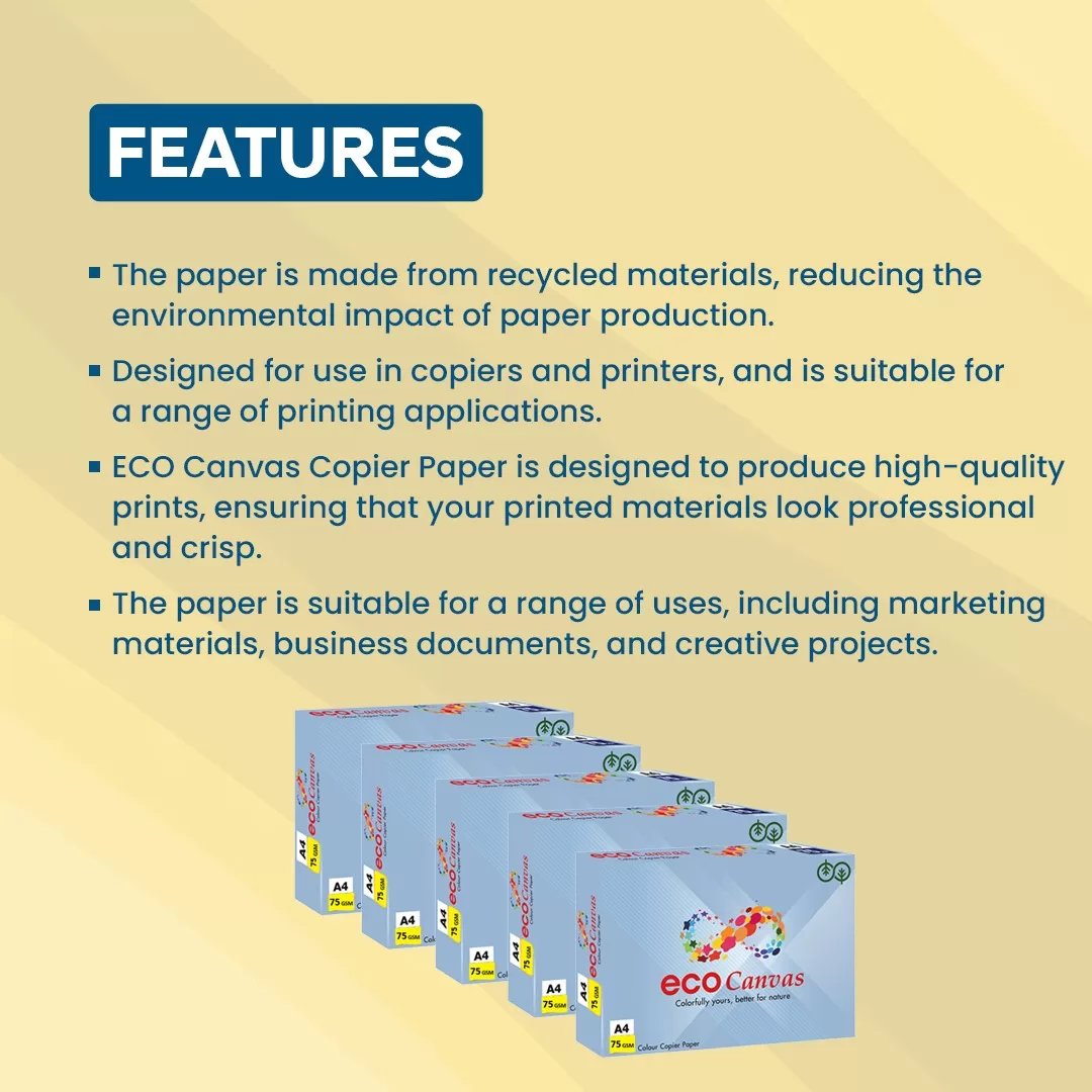 The ECO CANVAS COLOUR PAPER is a high-quality, multipurpose coloured paper designed to bring life to your documents, presentations, crafts, and projects while maintaining a commitment to the environment. Available in a range of vivid colours (typically Pink, Blue, Yellow, and Green) and a standard A4 size, this 75 GSM paper strikes the perfect balance between superior print quality and eco-conscious manufacturing.