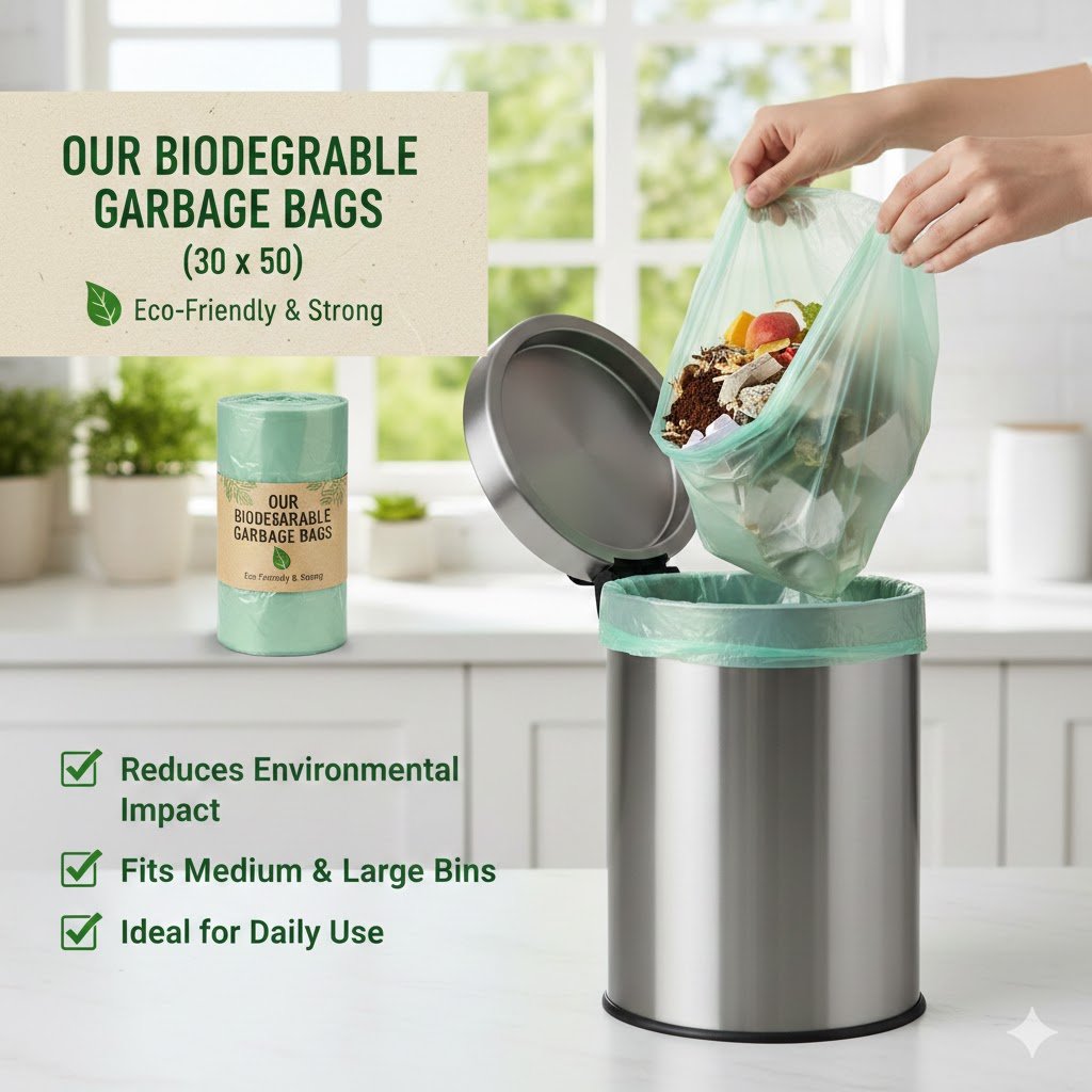 The Biodegradable Garbage Bag 30 x 50 is an eco-friendly solution for everyday waste disposal. Made from biodegradable material, these garbage bags are designed to decompose naturally over time, helping reduce environmental impact while keeping your surroundings clean and hygienic.
