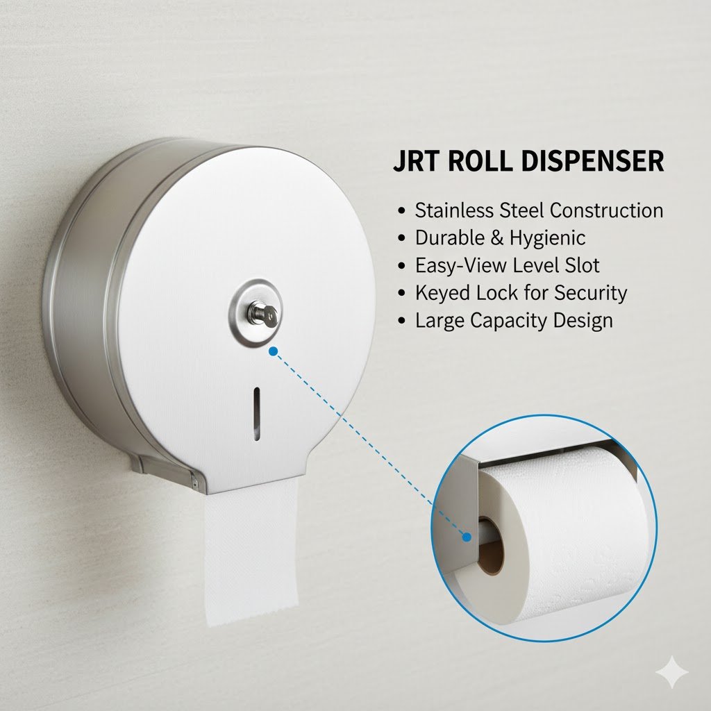 The JRT Roll Dispenser is a reliable and efficient solution for dispensing JRT (Jumbo Roll Tissue) in commercial and public washrooms. Designed for smooth and controlled dispensing, it helps reduce paper wastage while ensuring hygiene and convenience.
