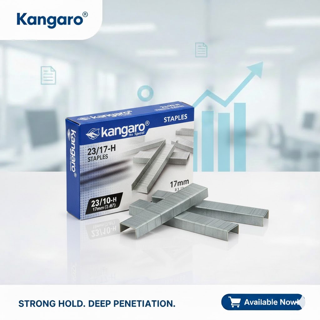 The Kangaro 23/17-H Stapler Pins are heavy-duty staples designed for secure and long-lasting binding of thick paper bundles. Manufactured from high-quality hardened steel, these 17 mm pins deliver smooth penetration, strong holding power, and jam-free performance. Ideal for use with compatible heavy-duty staplers, they are perfect for offices, print shops, and professional document binding needs.