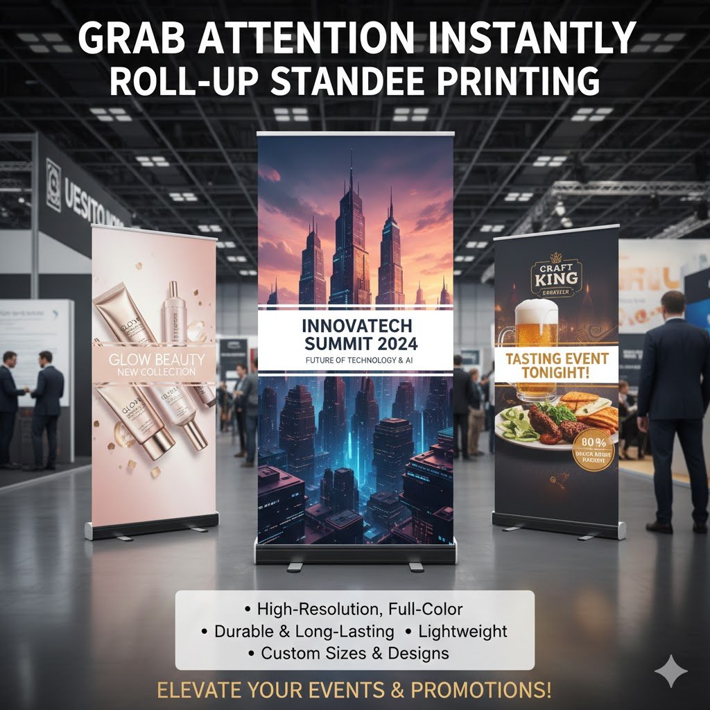 Grab attention instantly with roll-up standee printing, the perfect solution for events, exhibitions, promotions, and in-store branding. Our standees are printed in high resolution with vibrant colors, ensuring your message stands out clearly from a distance.