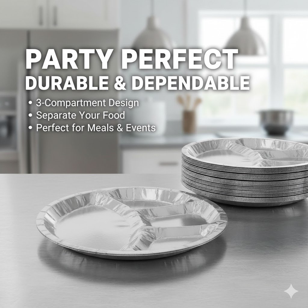 Serve a variety of foods in style with our Disposable Silver Square Paper Plate with 3 compartments. Perfect for meals that require separation, this plate keeps snacks, appetizers, or entrees neatly divided, maintaining a clean and organized presentation.