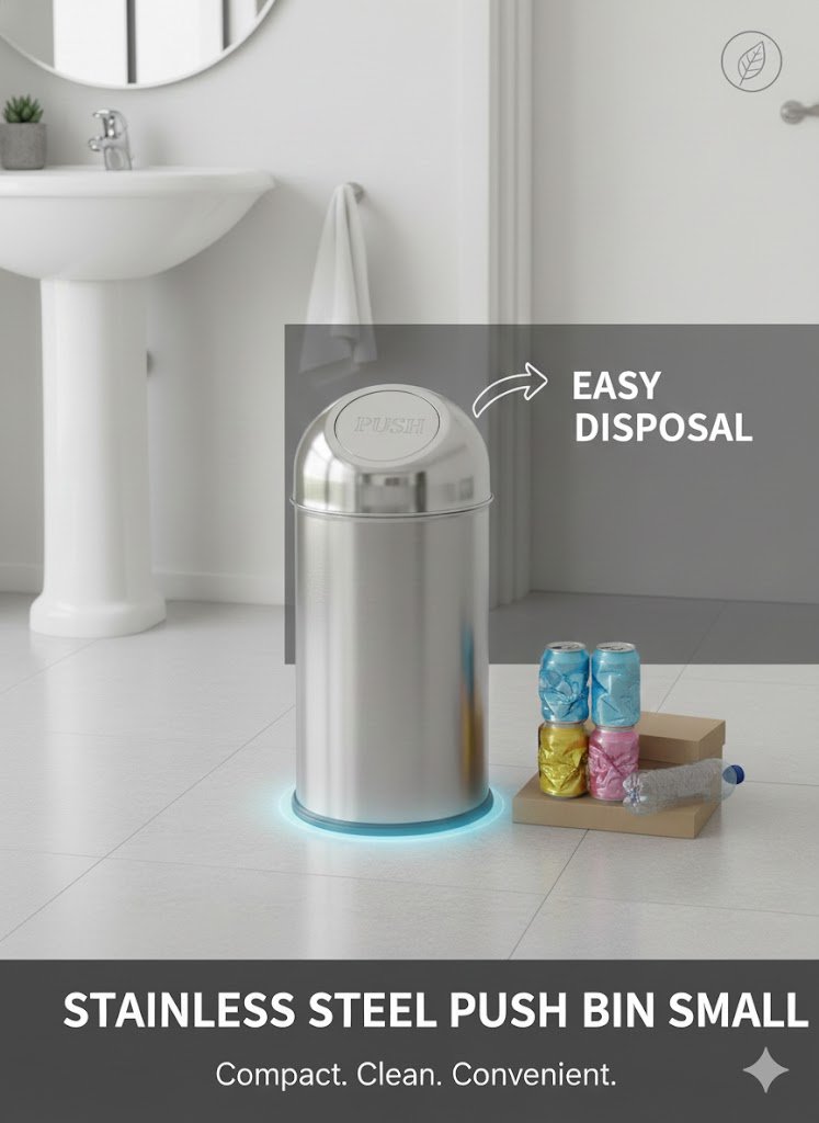 Keep your space tidy and stylish with our Stainless Steel Push Bin – Small. Designed for compact spaces like bathrooms, desks, or small kitchens, this bin offers convenient hands-free waste disposal with its push-to-open lid. Made from high-quality stainless steel, it is durable, rust-resistant, and easy to clean, providing a long-lasting, hygienic solution for your everyday trash needs.