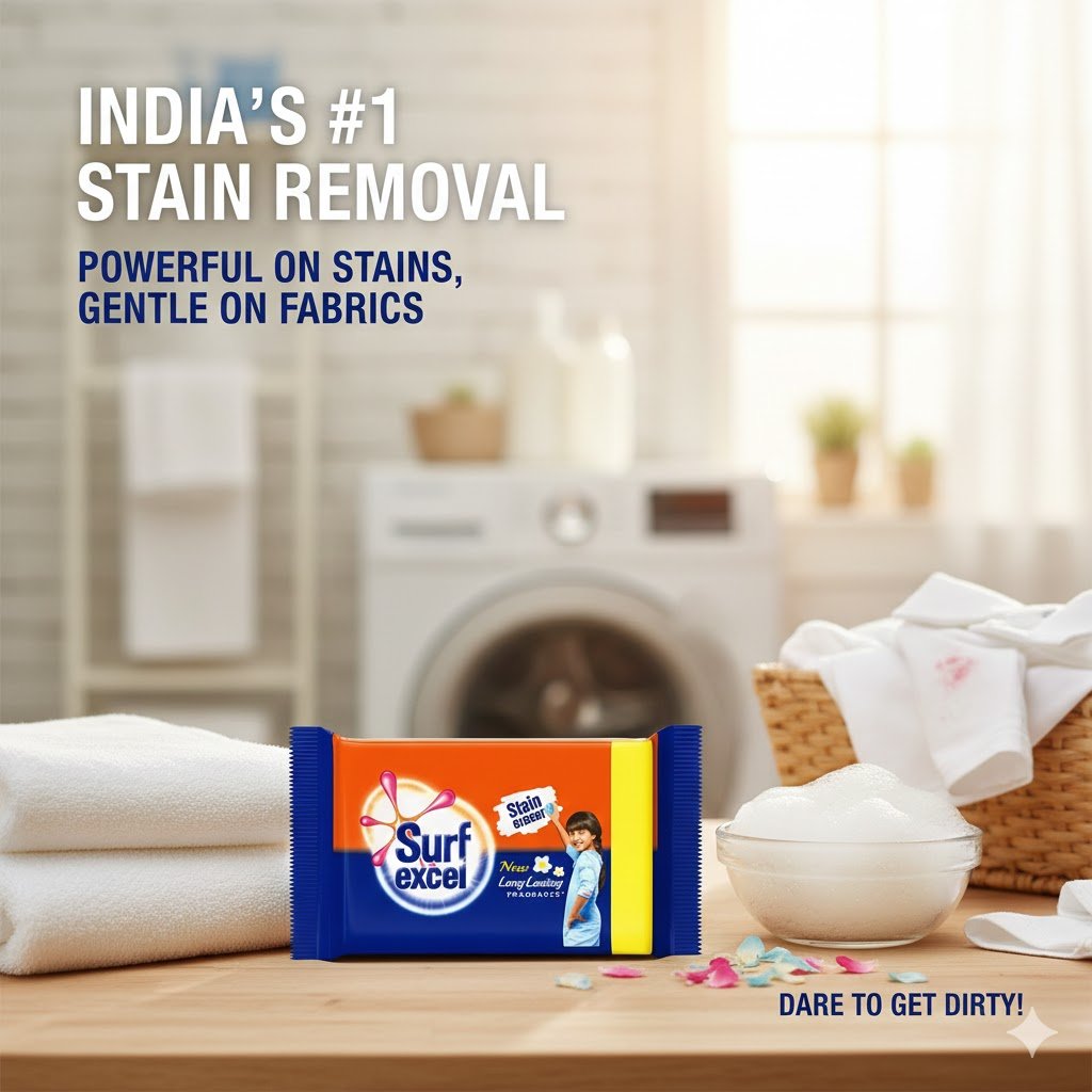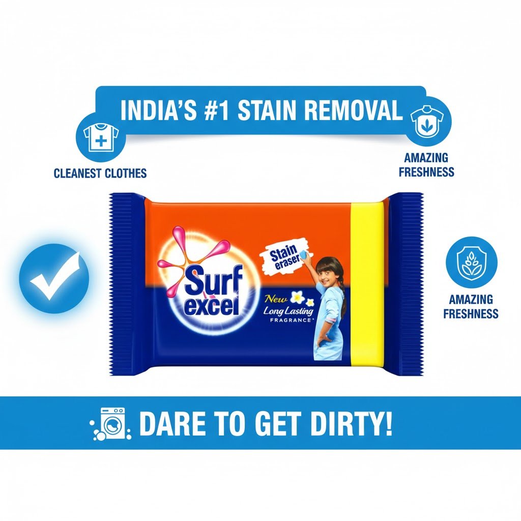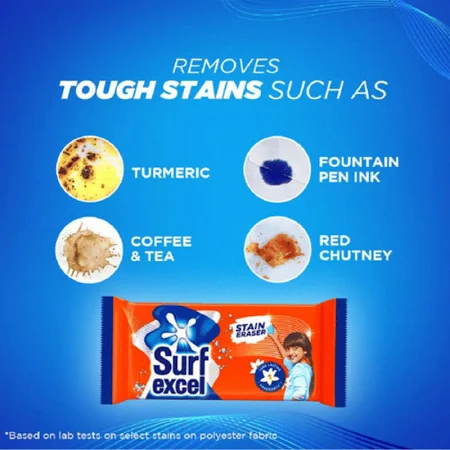 Bring Back the Shine to Your Clothes Don’t let stubborn stains ruin your favorite garments. The Surf Excel Detergent Bar is engineered with advanced “Stain Eraser” technology, designed to target and dissolve even the most difficult marks—like oil, grease, ink, and tea—in just one stroke. It combines the power of a premium detergent with the convenience of a bar, ensuring your whites stay white and your colors stay vibrant