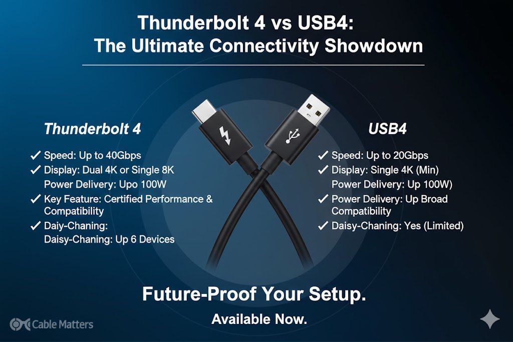 Thunderbolt and USB cables are universal connectivity standards used for data transfer, video output, and power delivery, differing primarily in their performance capabilities and connector types. Thunderbolt is a high-performance, proprietary technology, while USB (Universal Serial Bus) is a widely adopted industry standard with various physical connector types.