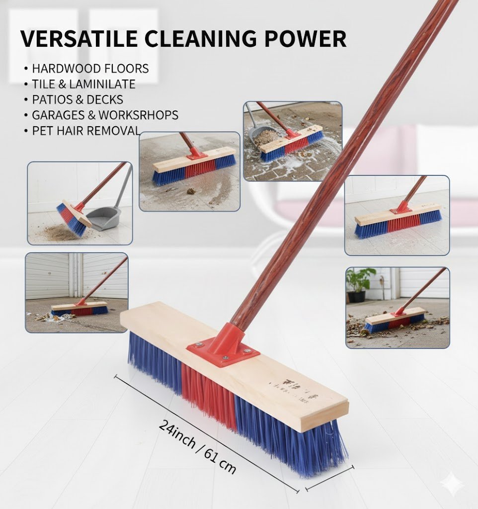 The 24-inch Wooden Brush is a durable and efficient cleaning tool, ideal for sweeping large areas quickly and effectively. Crafted with a sturdy wooden handle, it offers a comfortable grip and long-lasting performance. Its bristles are designed to remove dust, dirt, and debris from floors, carpets, and other surfaces, making it perfect for both home and commercial use.